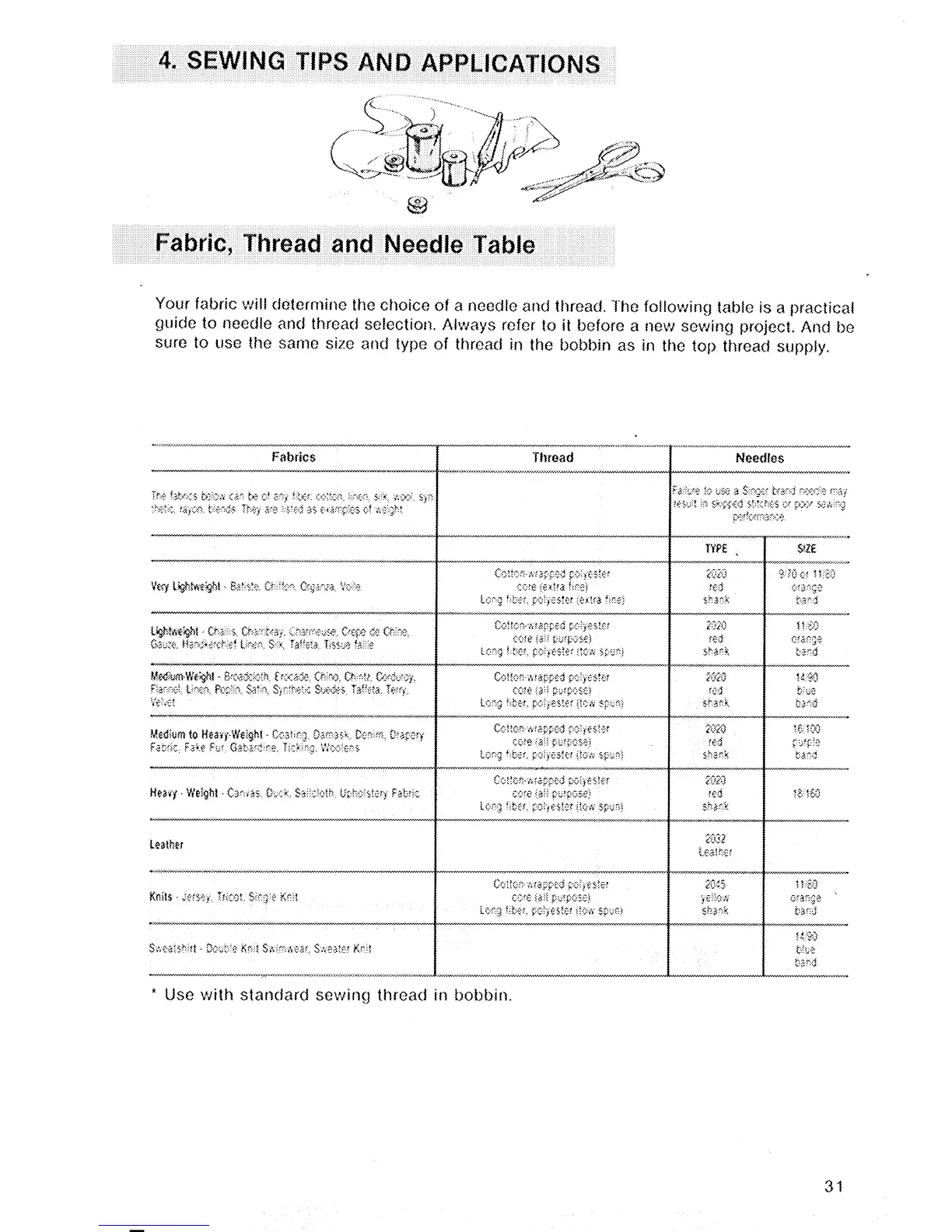 Singer 2210 - Sewing Tips and Applications; Fabric, Thread and Needle Table