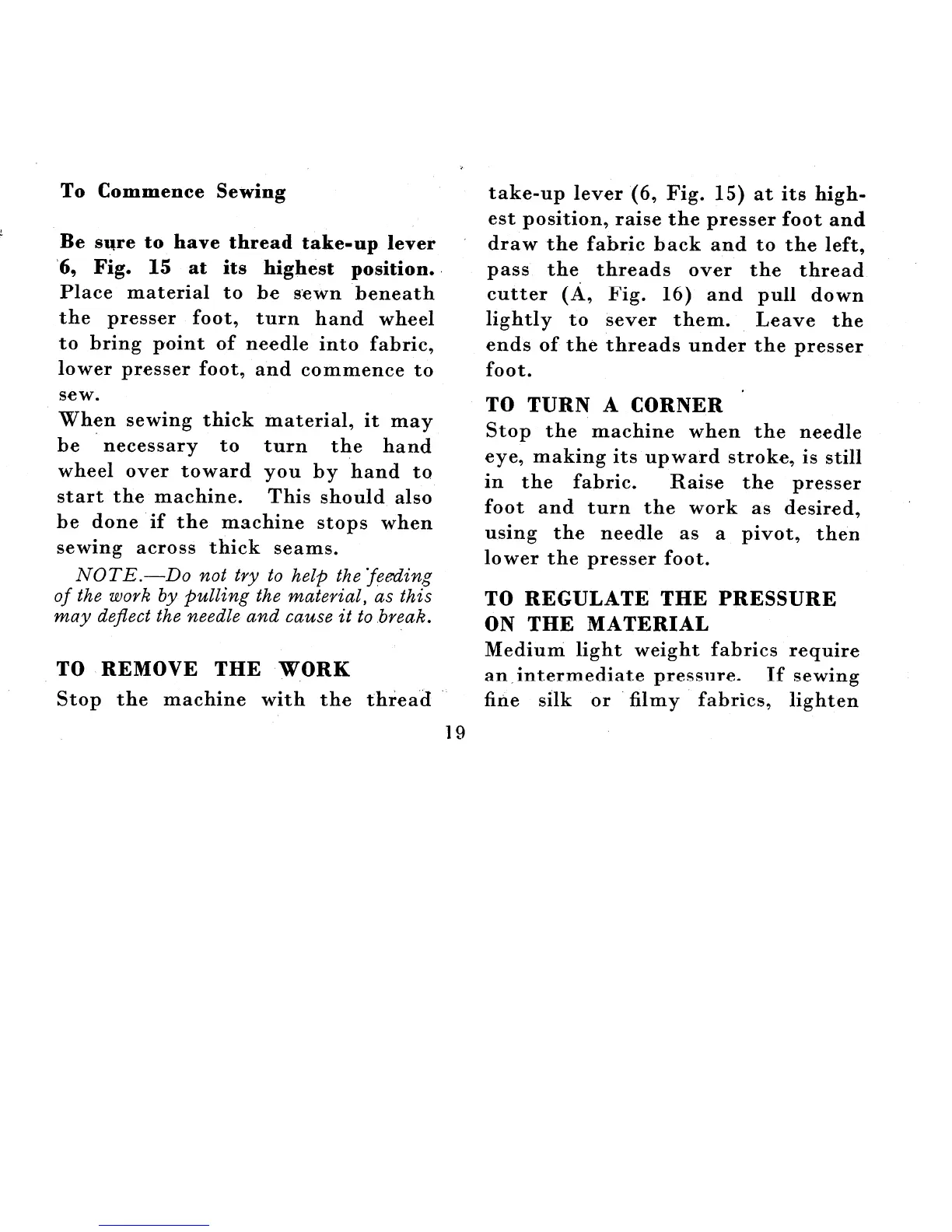 Singer 222K - Sewing Procedures and Adjustments; Starting and Continuing Sewing; Removing Work and Turning Corners; Regulating Presser Foot Pressure