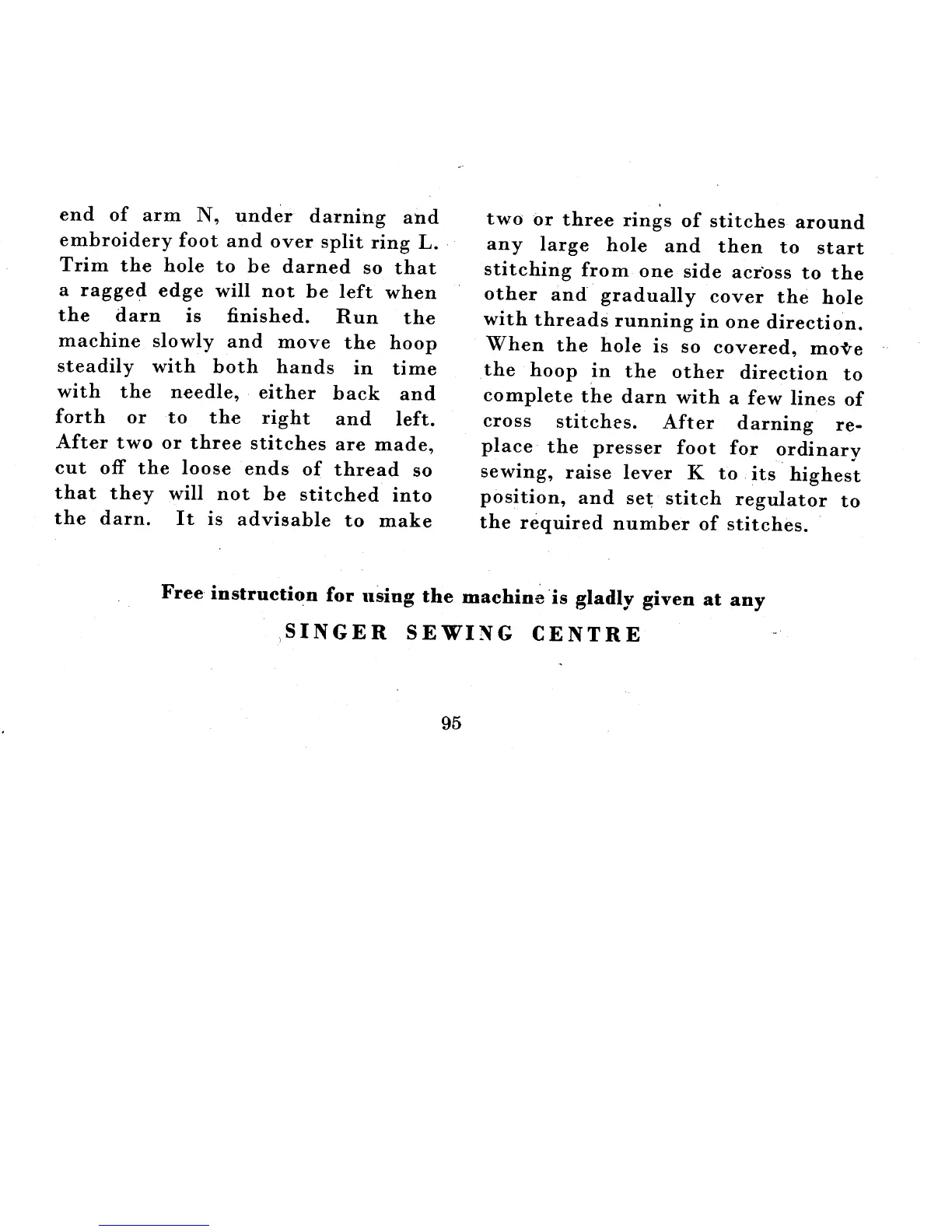 Singer 222K - Completing Darning Stitches; Darning Stitches and Machine Reset
