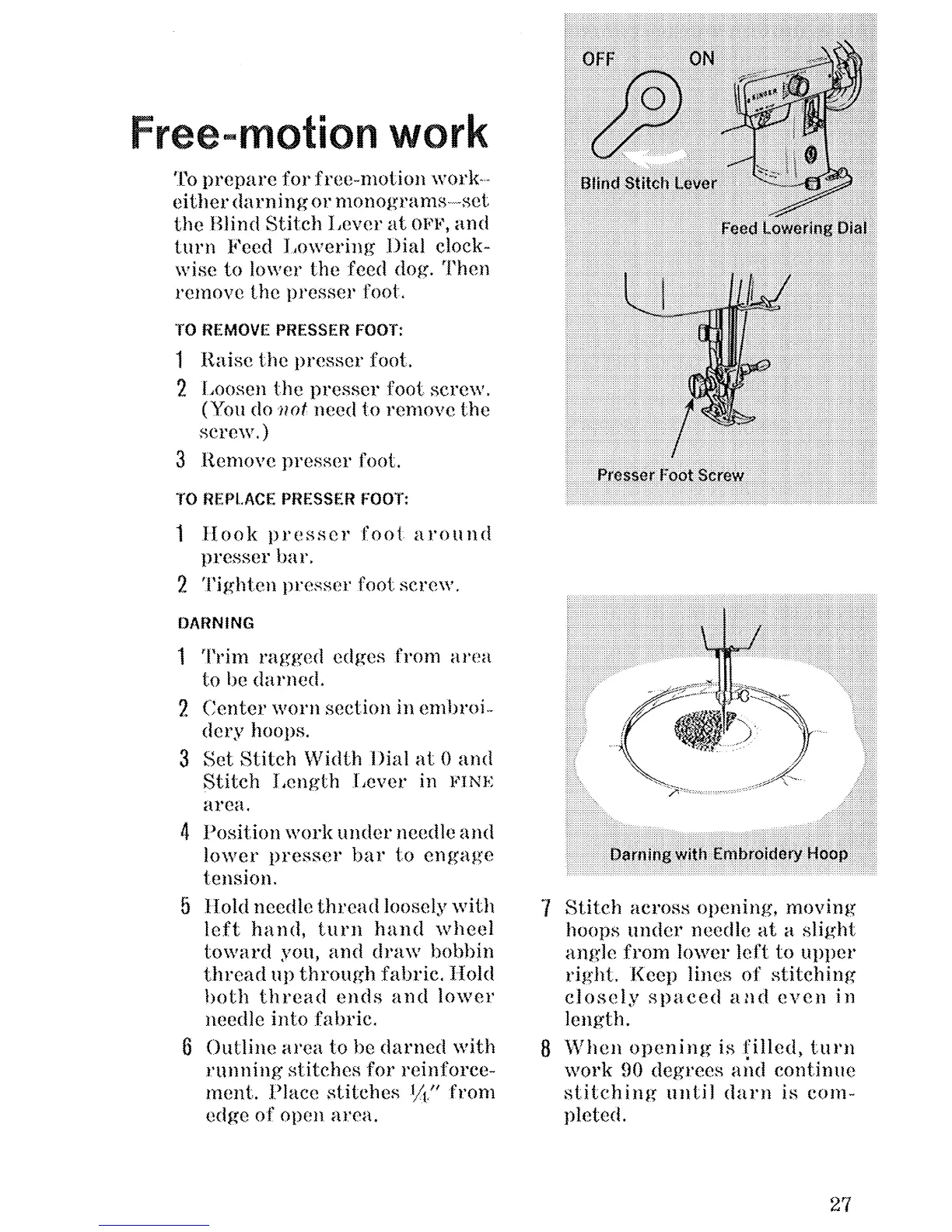 Singer 223 - Free-Motion Work; To Remove Presser Foot; To Replace Presser Foot; Darning