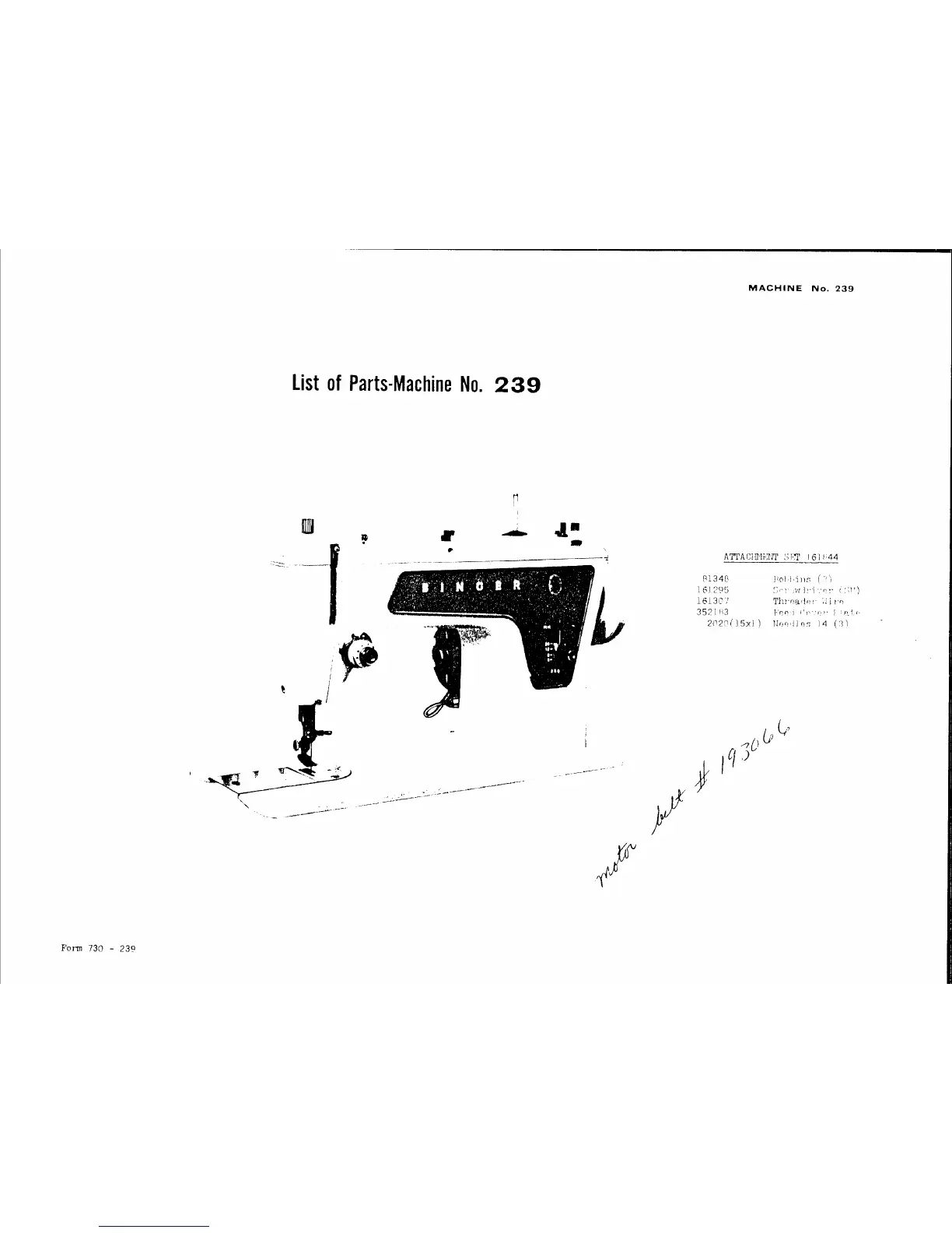 Singer 239 - Singer 239 Parts List; Attachment Set Parts