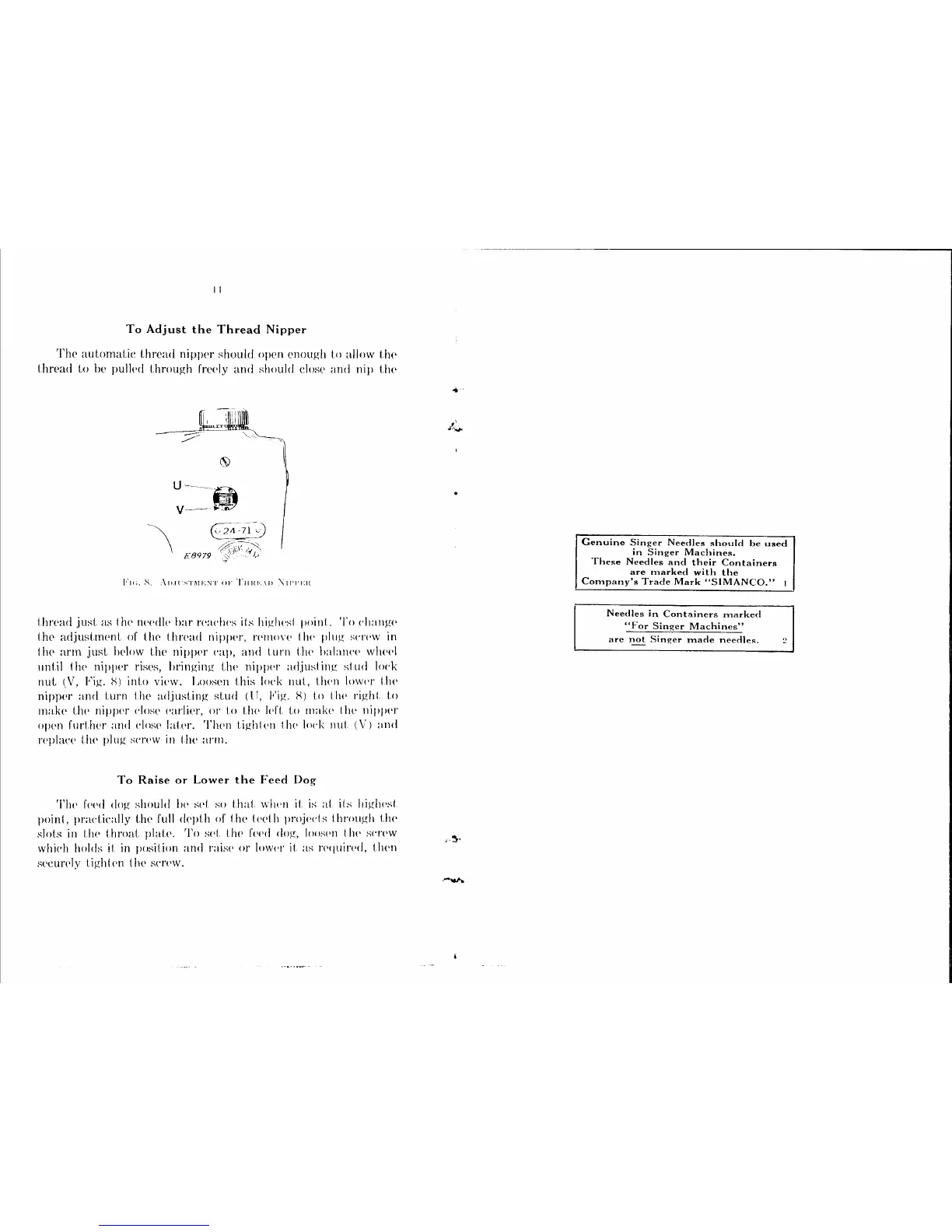 Singer 24-71 - To Adjust the Thread Nipper; Thread Nipper Adjustment; To Raise or Lower the Feed Dog; Feed Dog Height Adjustment