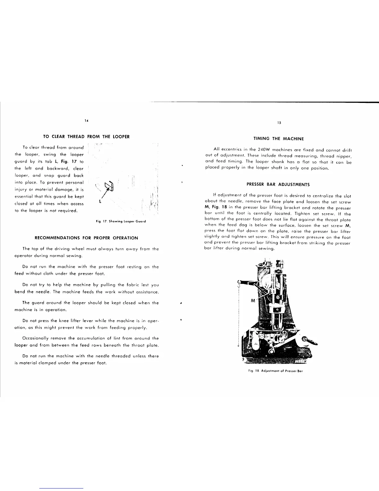 Singer 240W - To Clear Thread from the Looper; Recommendations for Proper Operation; Timing the Machine; Presser Bar Adjustments
