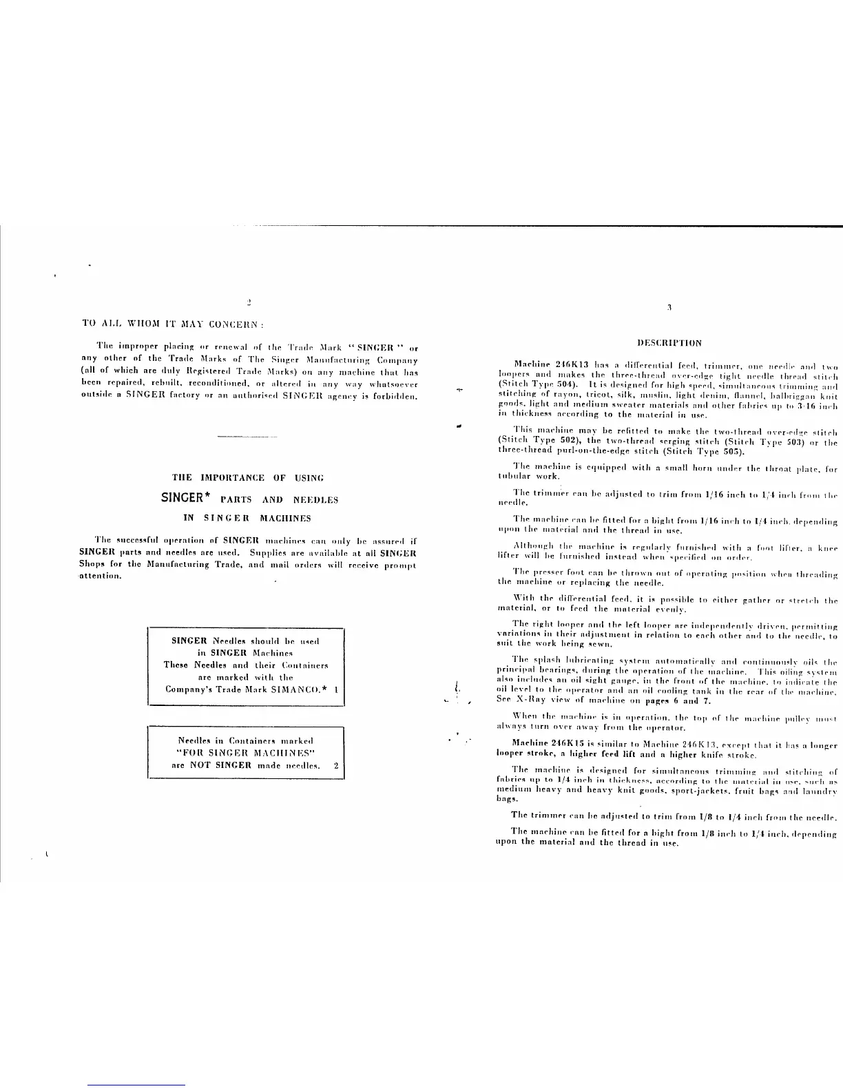 Singer 246K13 - Importance of Using Genuine Singer Parts; Machine Description Overview