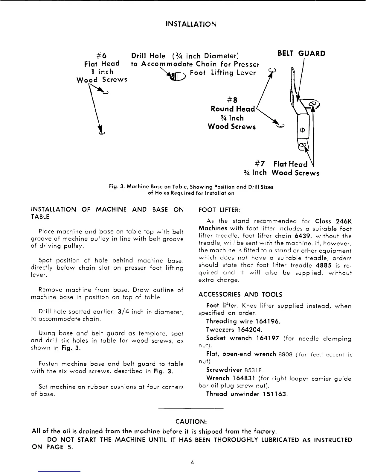 Singer 246K50 - Machine Installation and Setup; Installation of Machine and Base on Table