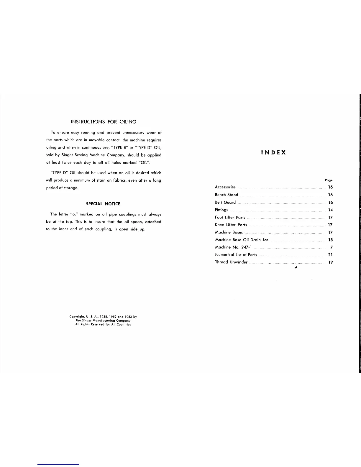 Singer 247-1 - Machine Operation and Ordering Instructions; Instructions for Oiling; Special Notice