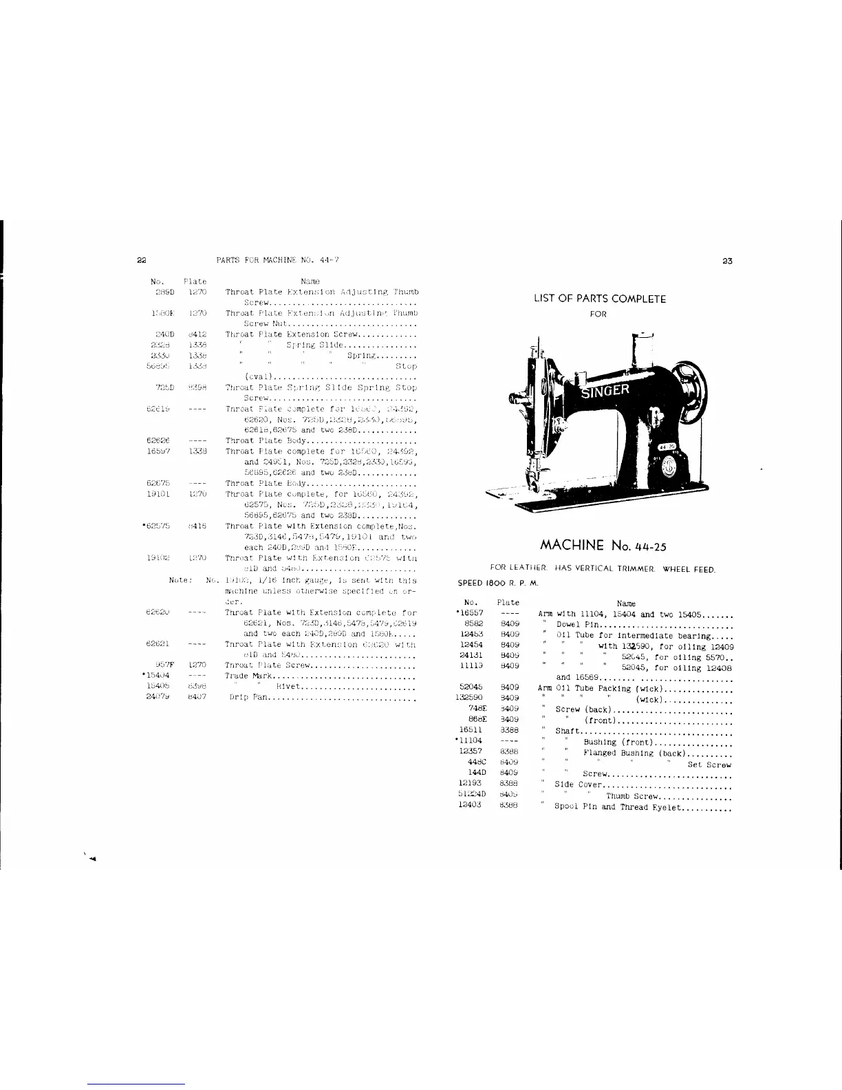 Singer 25 - List of Parts Complete for Machine No. 44-25