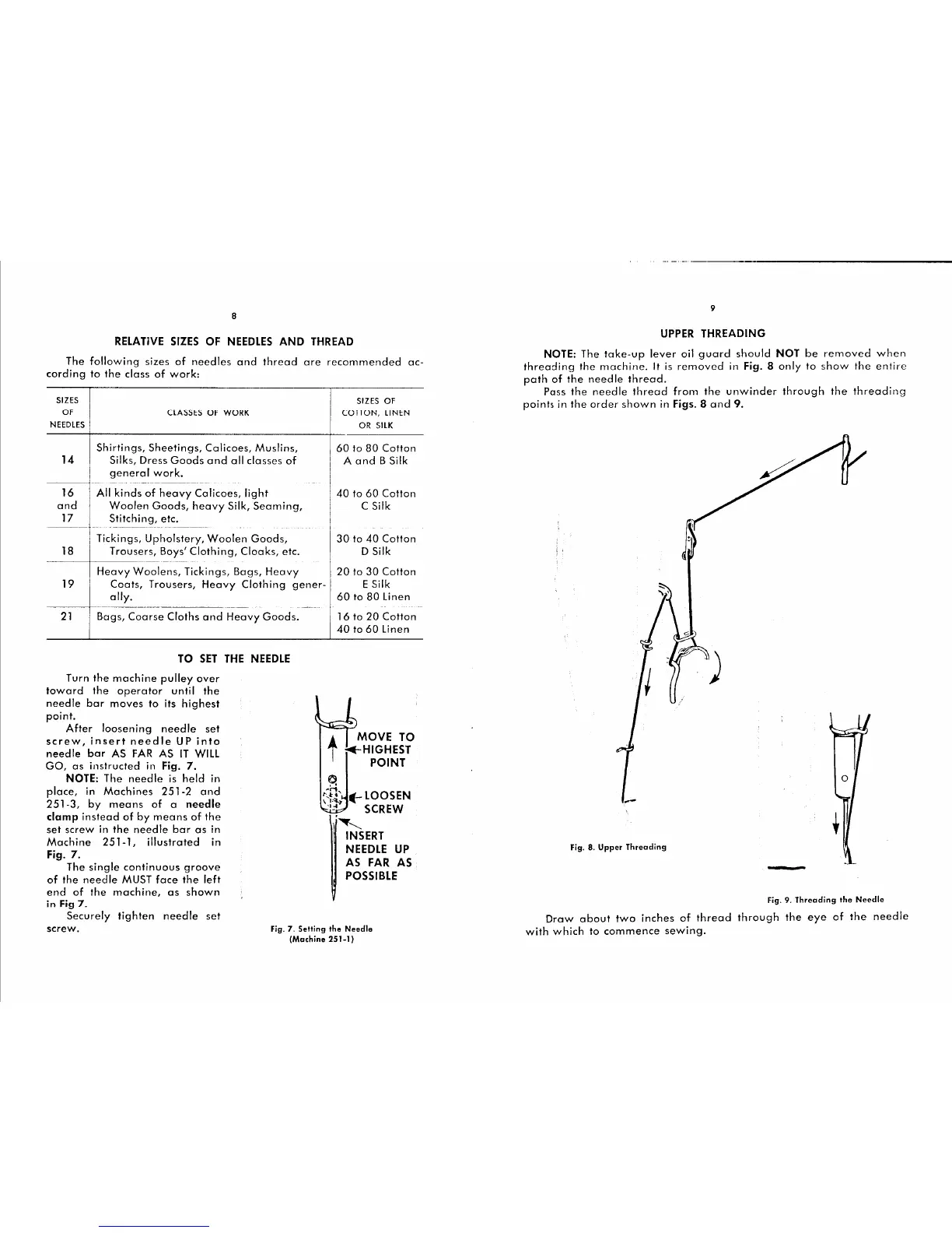 Singer 251 - Relative Sizes of Needles and Thread; To Set the Needle; Upper Threading