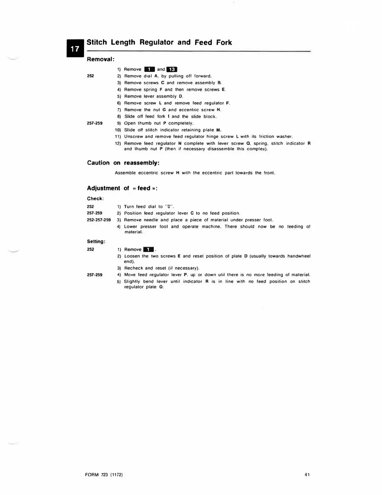 Singer 257 - Stitch Length Regulator and Feed Fork; Adjustment of feed