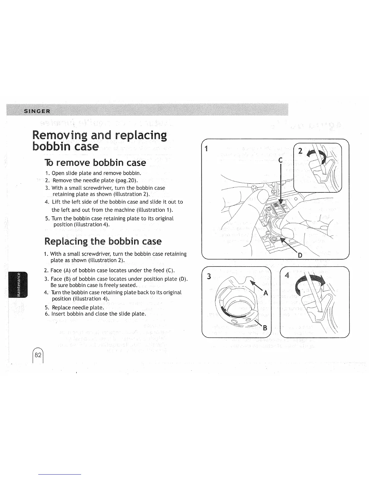 Singer 2732 - Removing and replacing bobbin case; To remove bobbin case; Replacing the bobbin case
