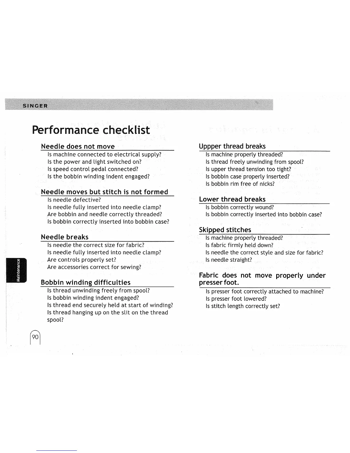 Singer 2732 - Performance checklist; Needle does not move; Needle moves but stitch is not formed; Needle breaks