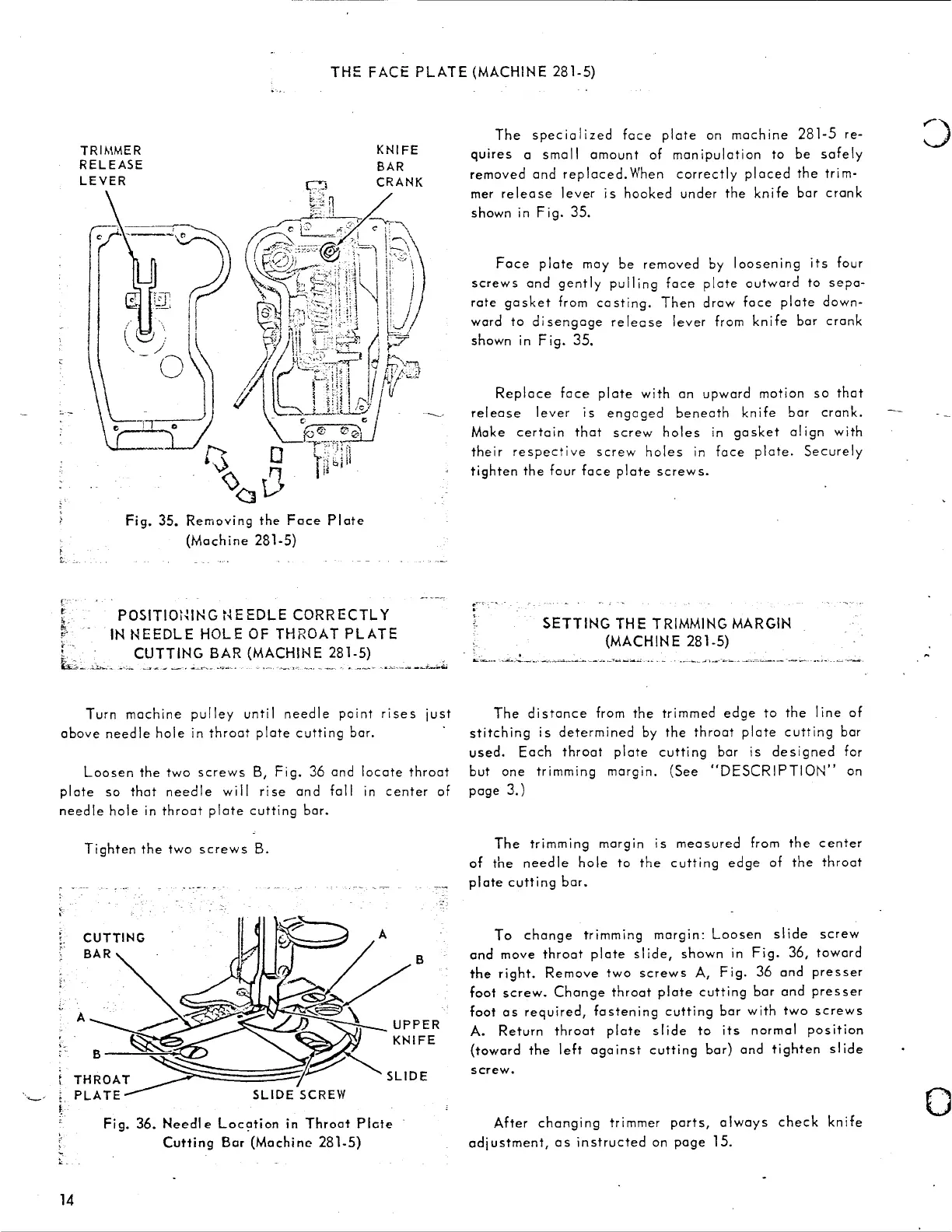 Singer 281-30 - FACE PLATE AND NEEDLE POSITIONING (Model 281-5); Face Plate Removal and Replacement; Positioning Needle in Throat Plate; Setting the Trimming Margin