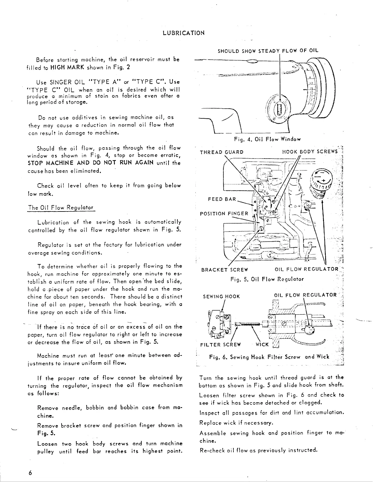 Singer 281-30 - LUBRICATION PROCEDURES; Oil Flow Regulator Adjustment; Sewing Hook Filter and Wick Maintenance