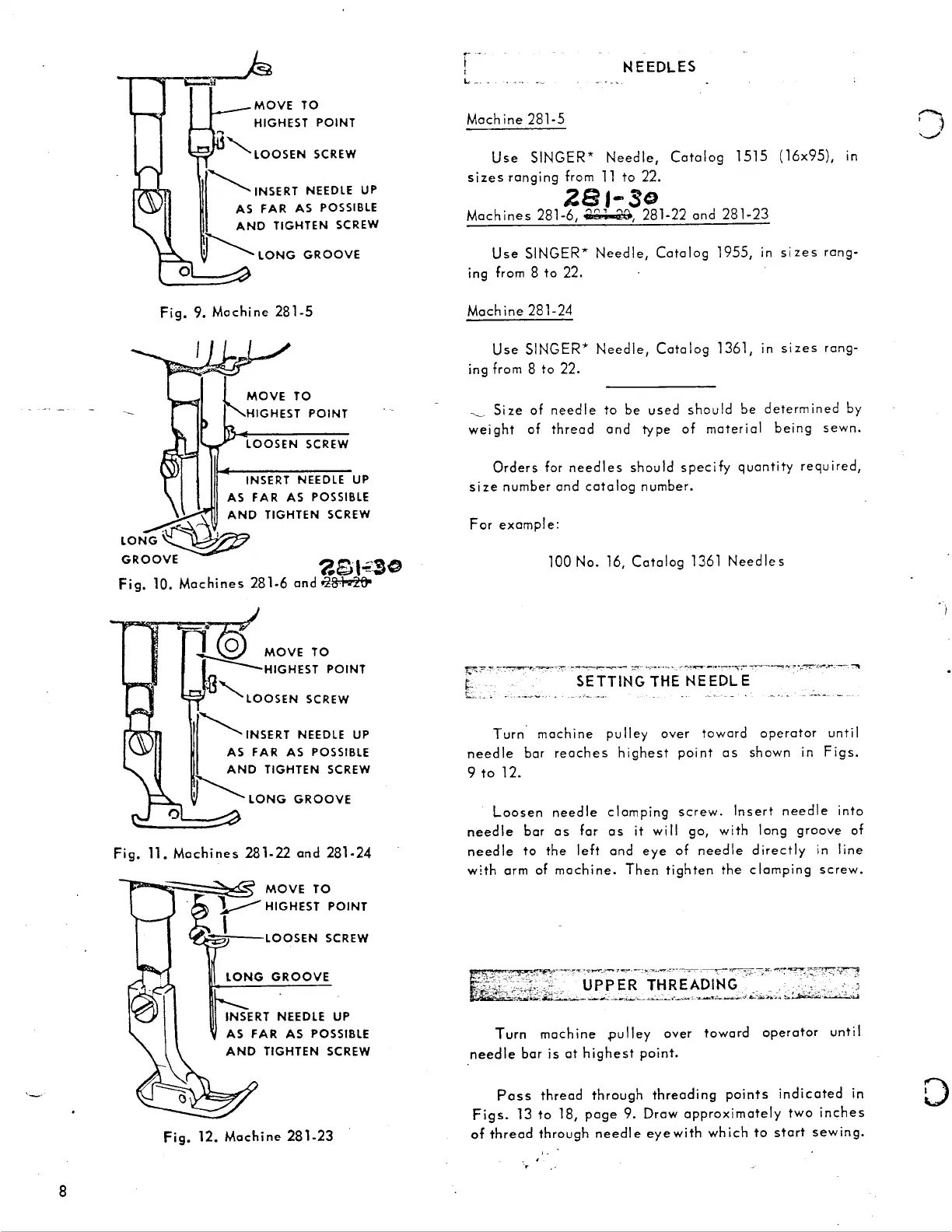 Singer 281-30 - NEEDLE INSTALLATION AND THREADING; Needle Selection by Model; Setting the Needle Correctly; Upper Threading Procedure