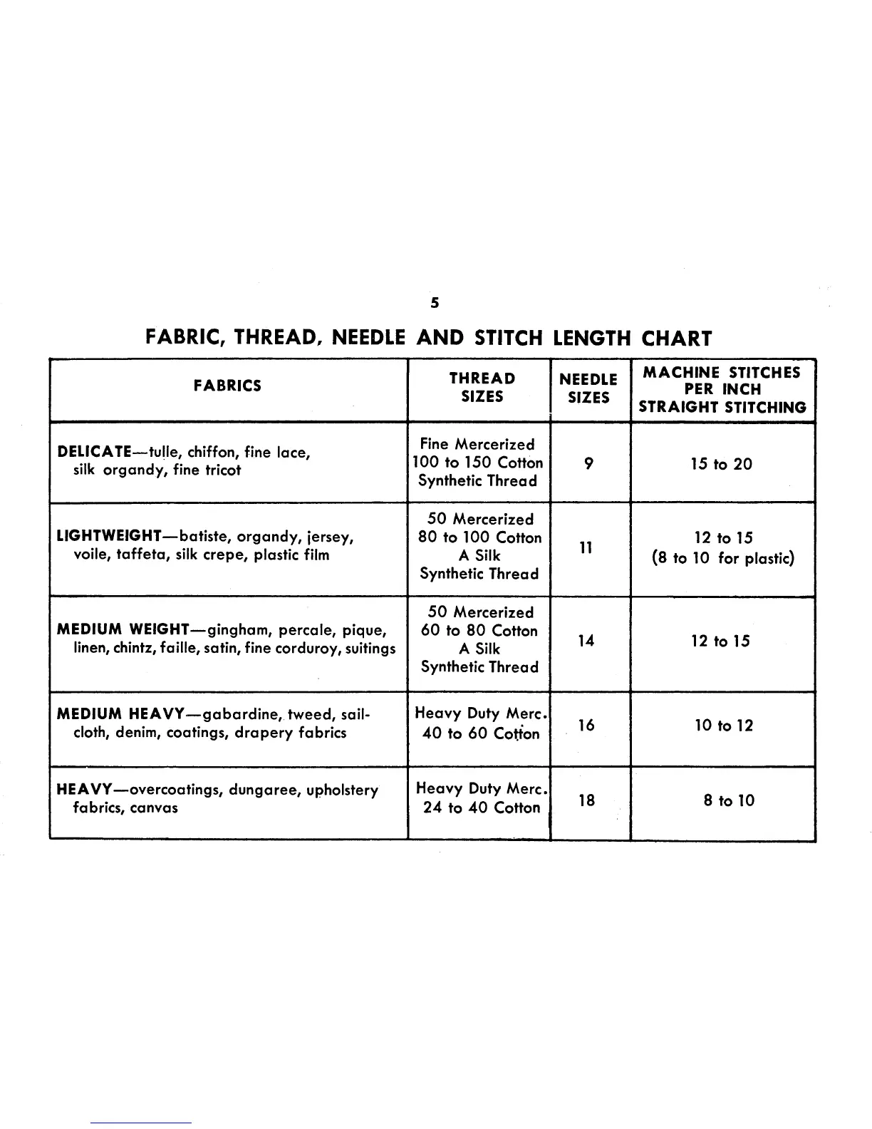 Singer 285K - Fabric, Thread, Needle and Stitch Length Chart