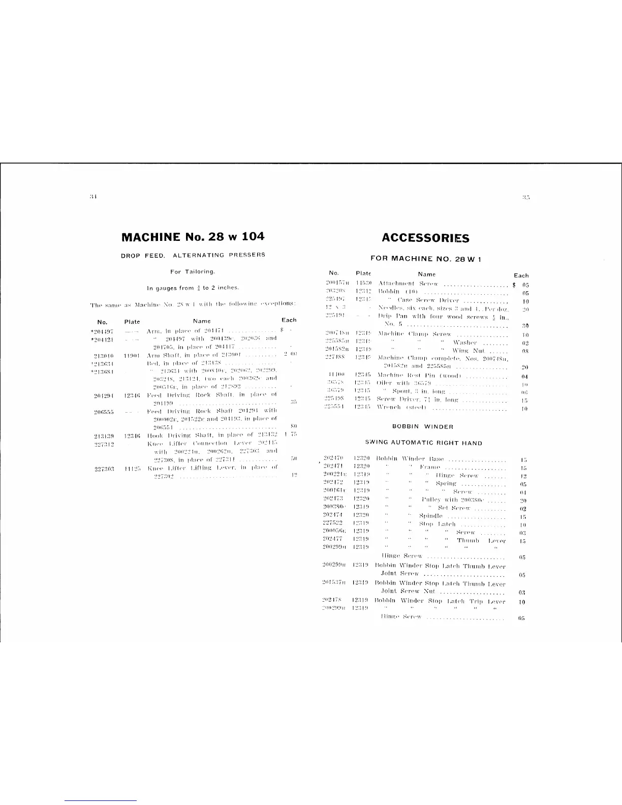 Singer 28W - ACCESSORIES; FOR MACHINE NO. 28 W 1