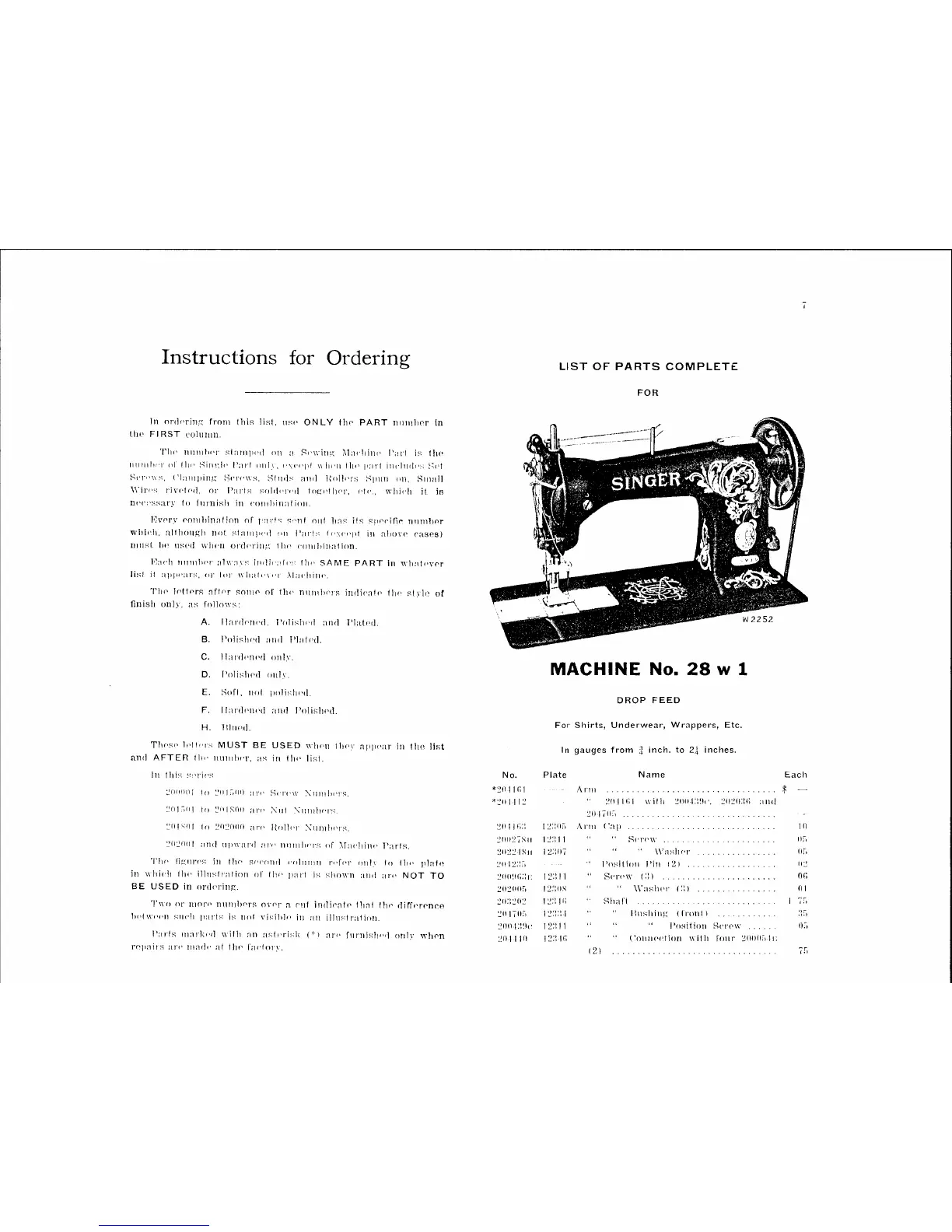 Singer 28W - Instructions for Ordering; LIST OF PARTS COMPLETE FOR MACHINE No. 28 w 1; DROP FEED For Shirts, Underwear, Wrappers, Etc.
