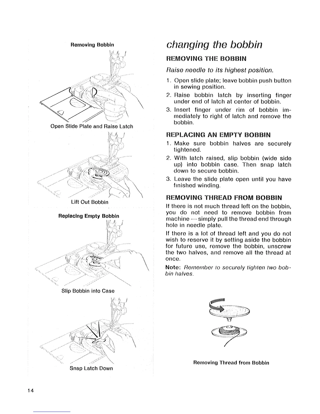 Singer 290 - Removing the Bobbin; Replacing an Empty Bobbin; Removing Thread from Bobbin