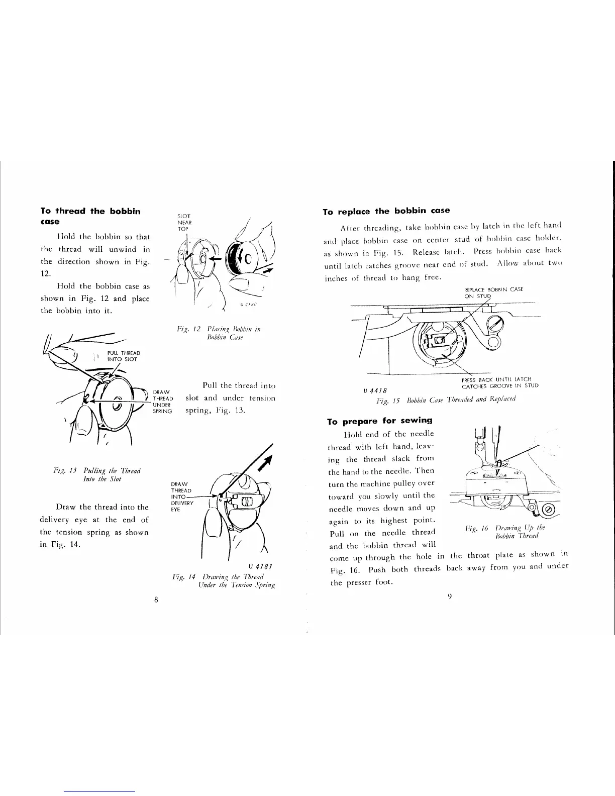 Singer 291U - Bobbin Case Threading and Replacement; Placing Bobbin in Bobbin Case; Pulling the Thread Into the Slot; Bobbin Case Threaded and Replaced