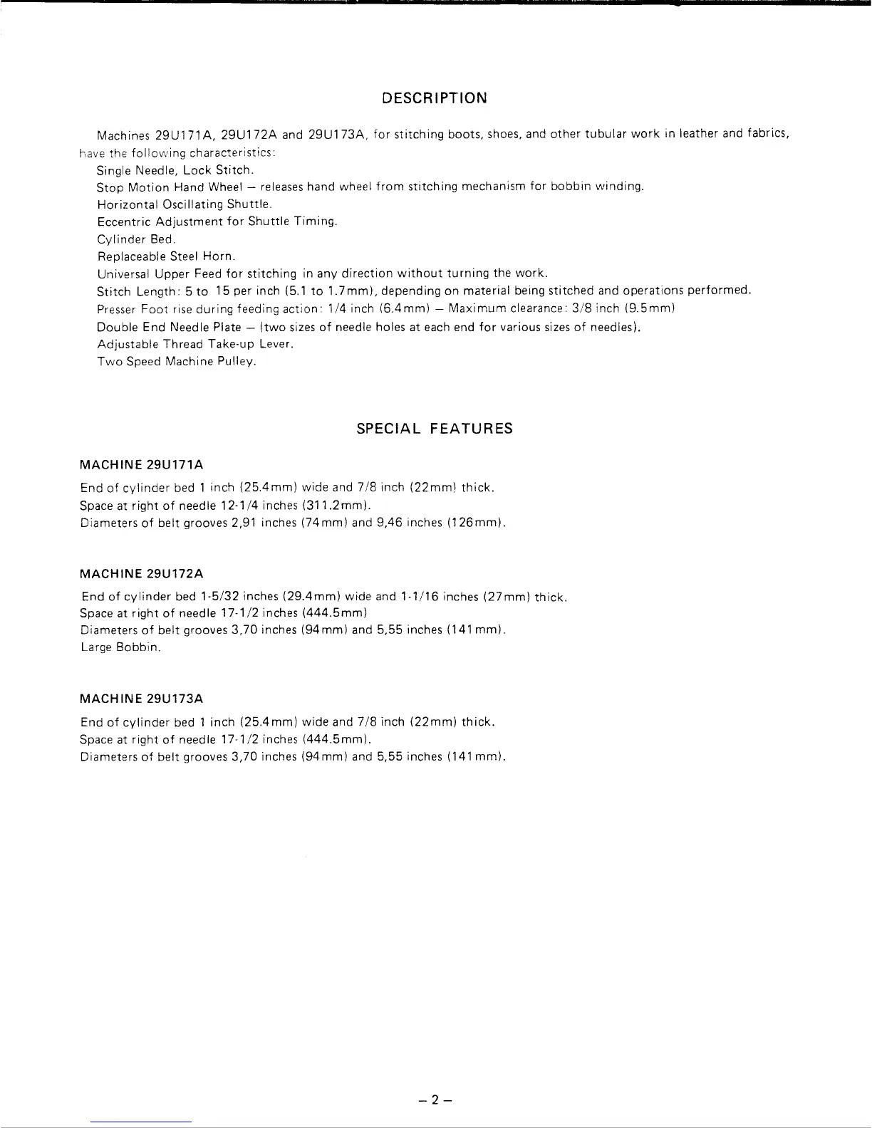 Singer 29U172A - DESCRIPTION; SPECIAL FEATURES