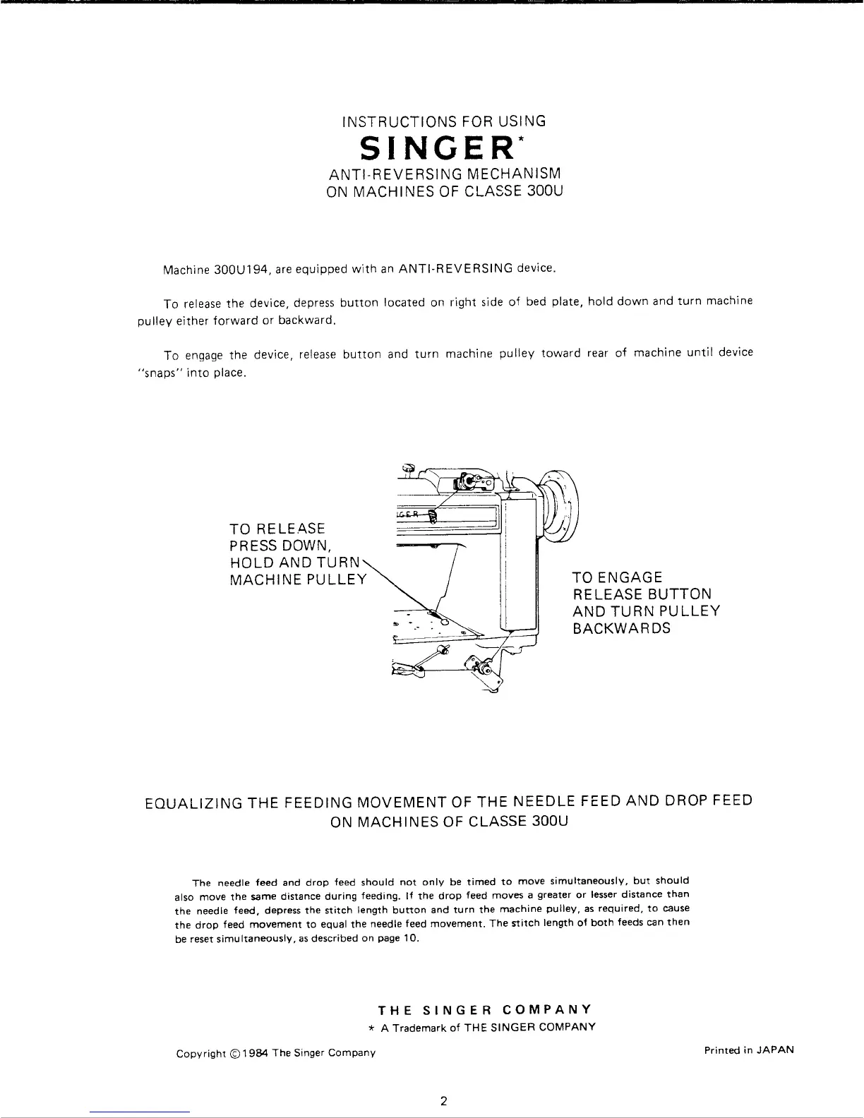 Singer 300U - Machine Operation Instructions; Anti-Reversing Mechanism; Equalizing Feeding Movement