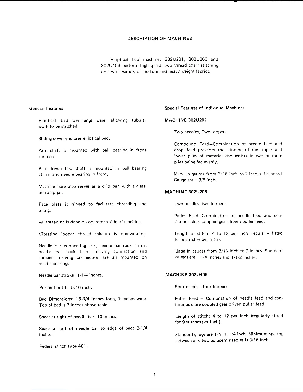 Singer 302U201 - Description of Machines; General Features; Special Features of Individual Machines