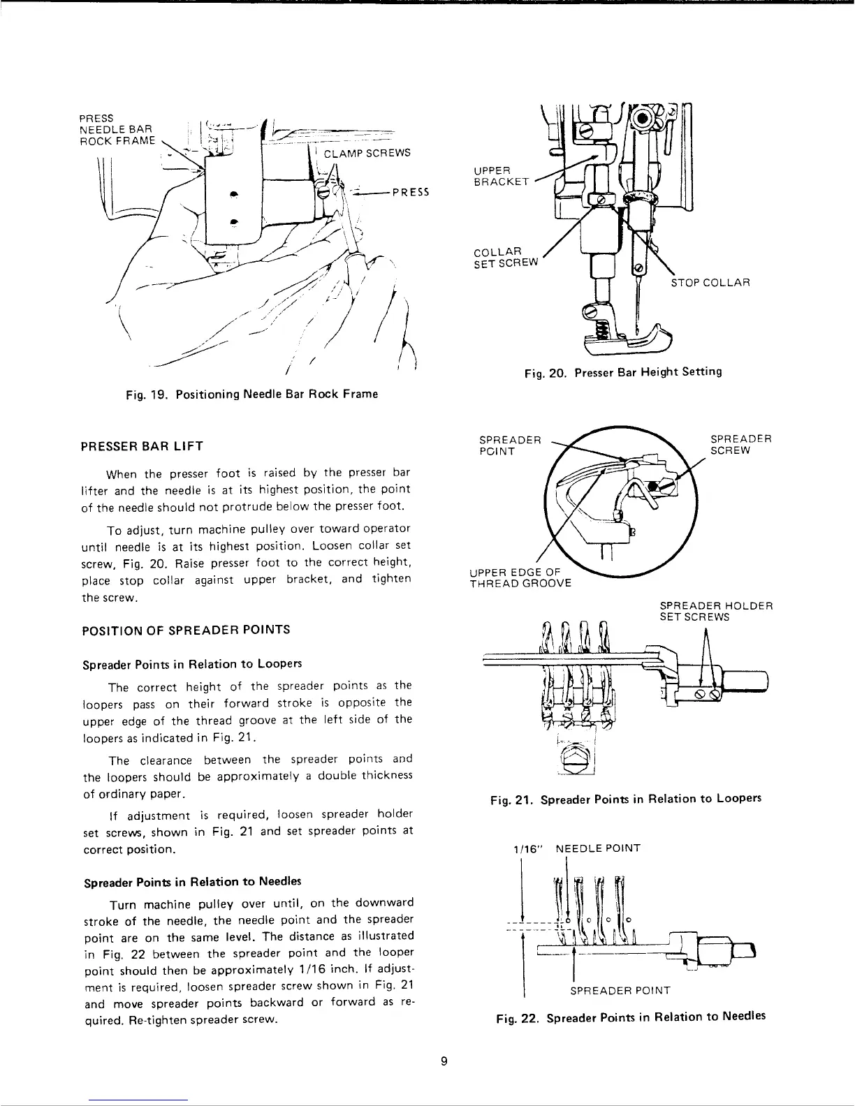 Singer 302U406 - Presser Bar and Spreader Points; Presser Bar Lift Adjustment; Spreader Points to Loopers; Spreader Points to Needles