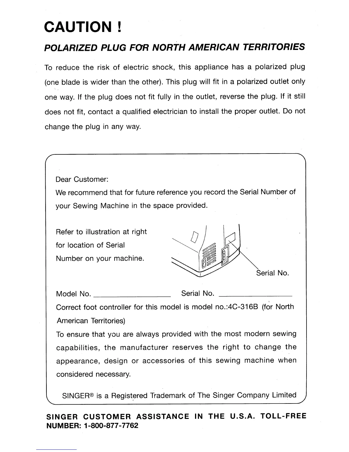 Singer 30518 - Cautions and Safety; Polarized Plug for North American Territories