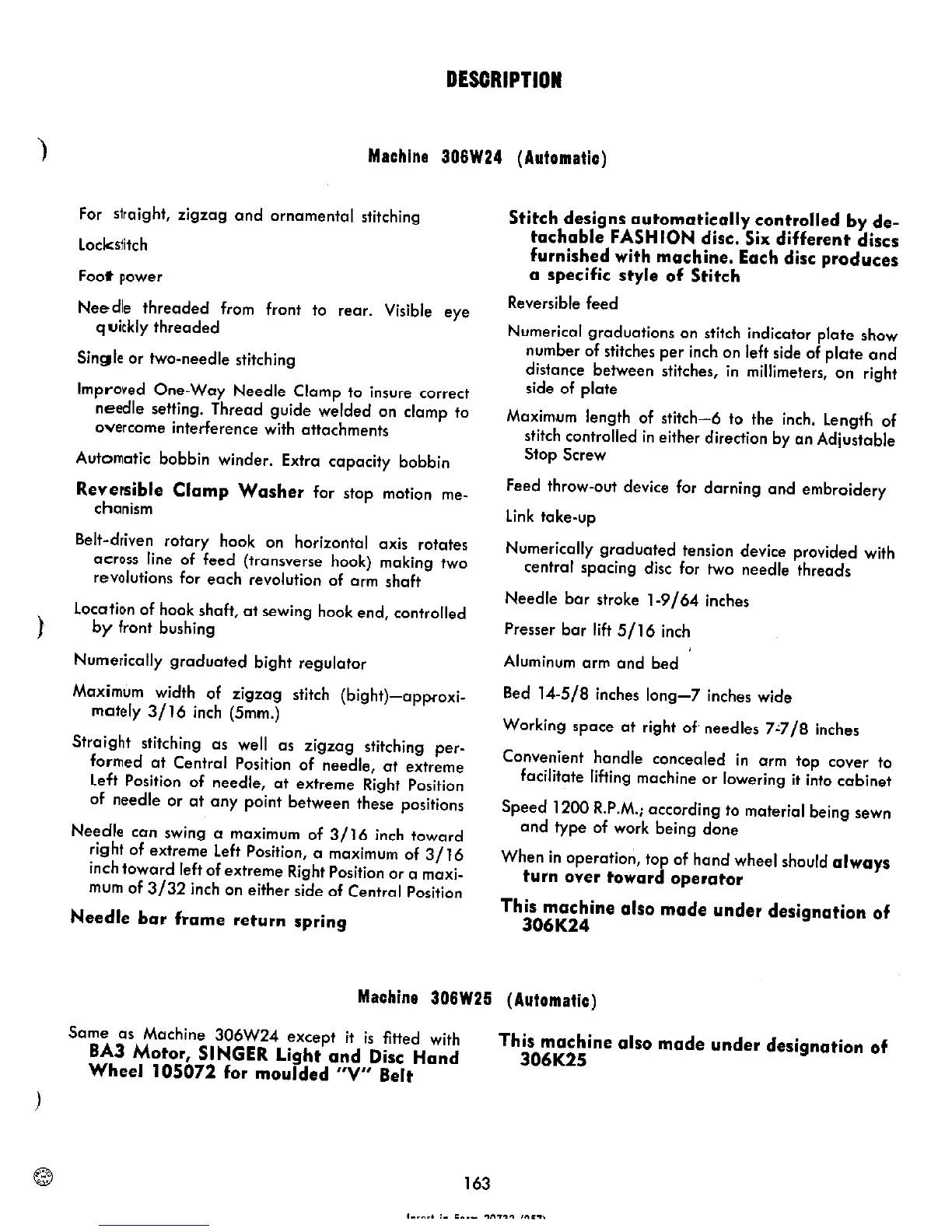 Singer 306 - DESCRIPTION; Machine 306 W24 (Automatic) Features