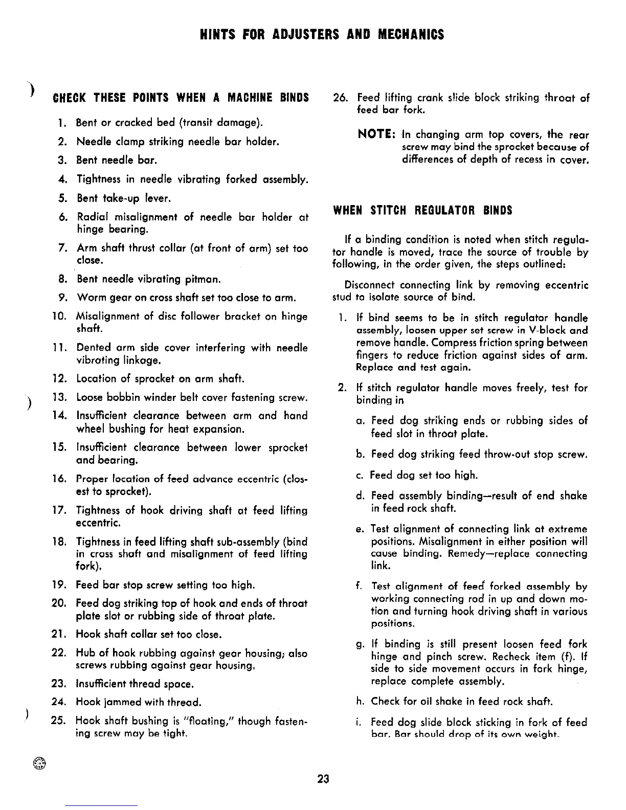 Singer 306 - HINTS FOR ADJUSTERS AND MECHANICS; Machine Binding Issues