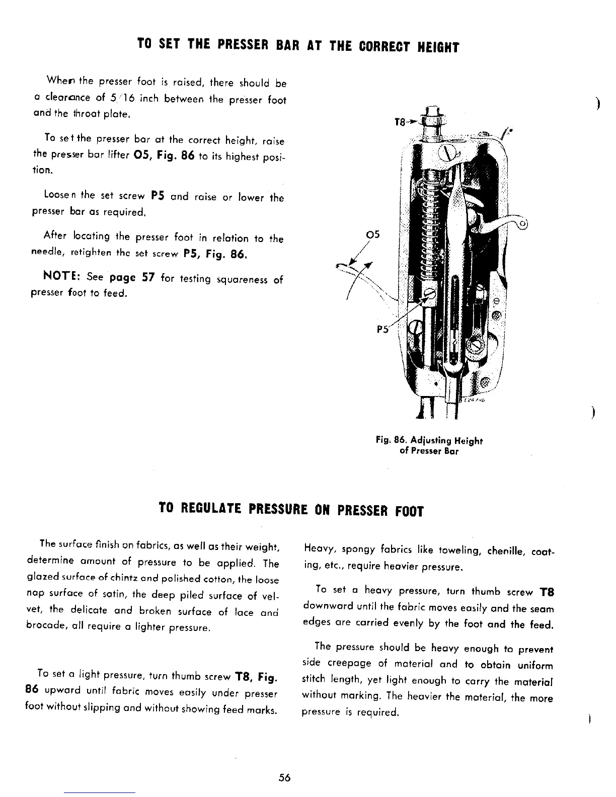 Singer 306 - To Set the Presser Bar at the Correct Height; To Regulate Pressure on Presser Foot