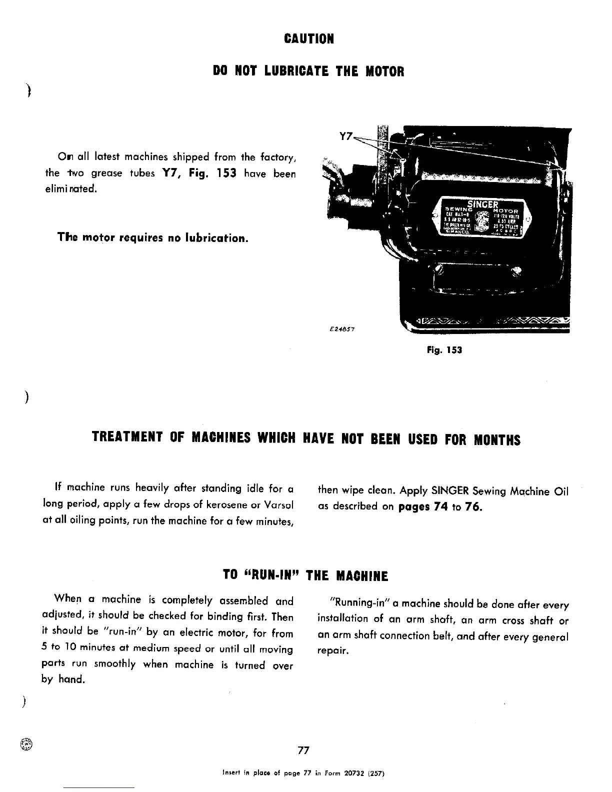 Singer 306 - Do Not Lubricate the Motor; Treatment of Machine Which Have Not Been Used for Months; To Run-In the Machine