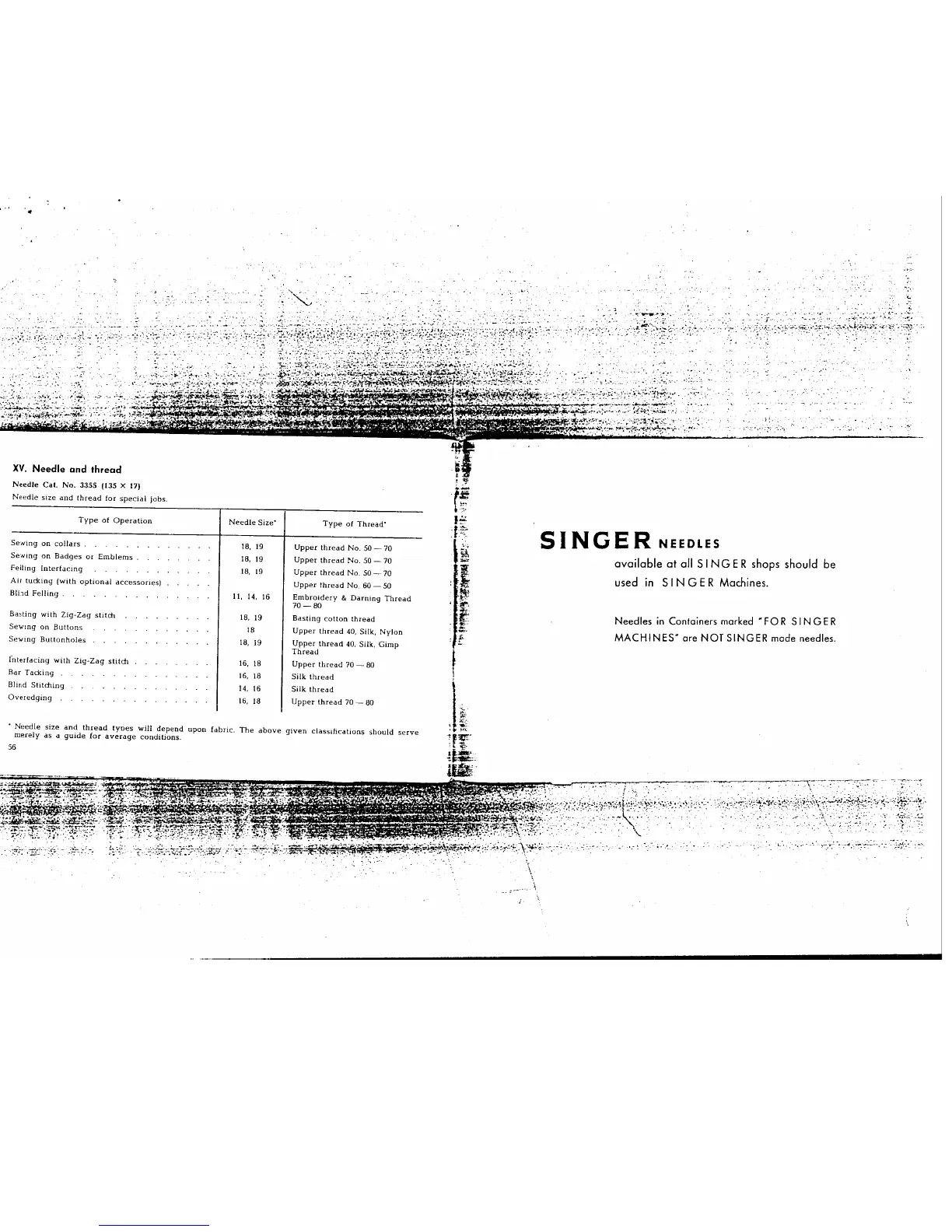 Singer 307 G - Needle and Thread Guide; Needle Size and Thread Types for Operations