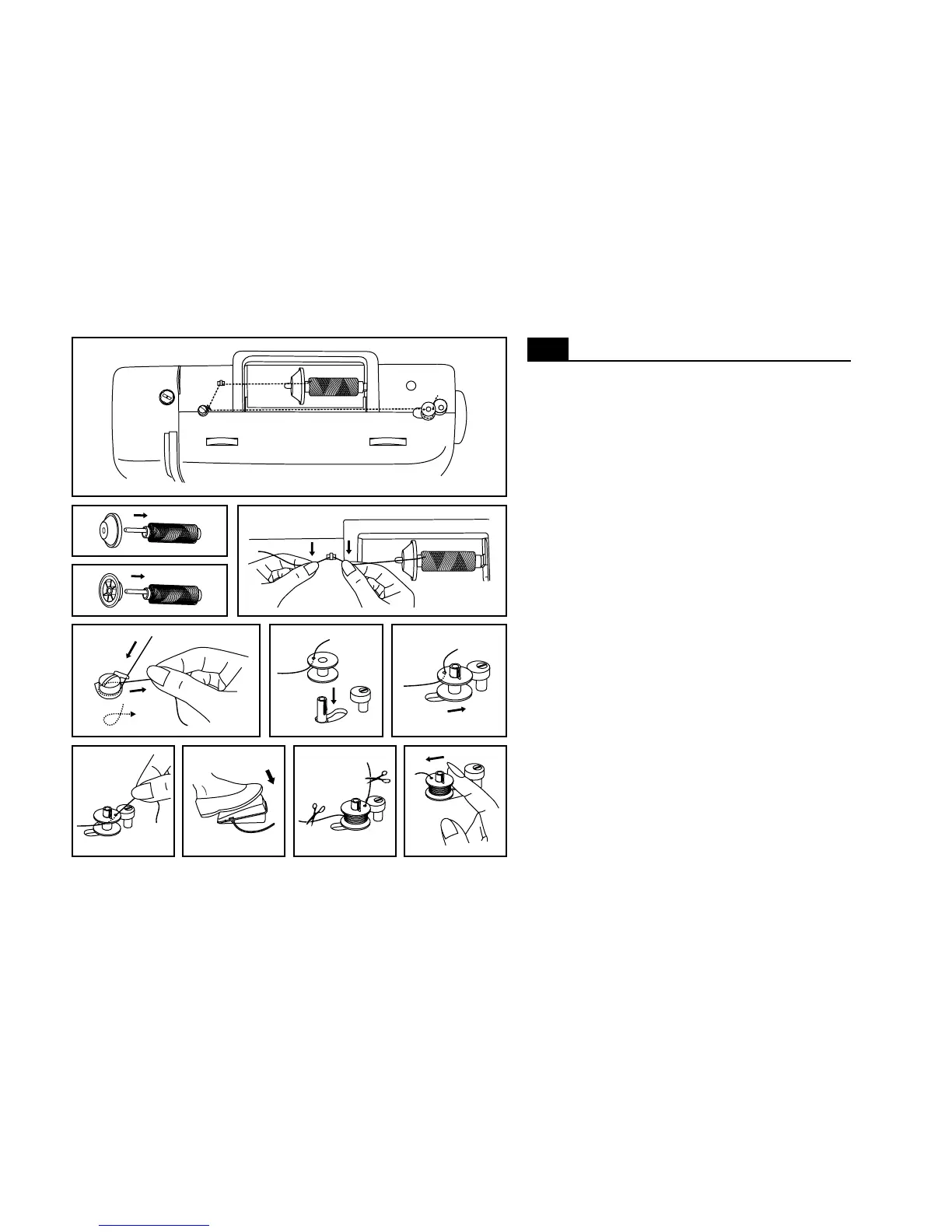 - Cut thread (9). Press bobbin to left (10) and remove.