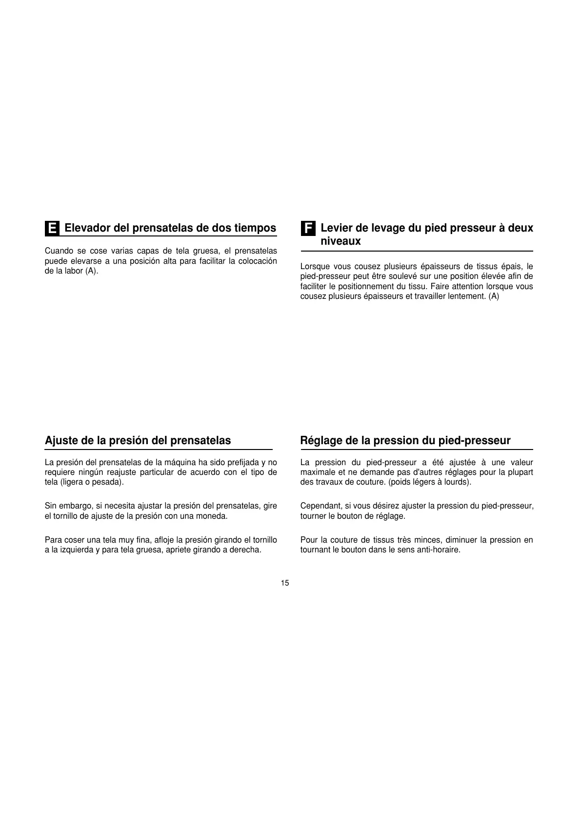 Singer 3116 - Elevador del Prensatelas de Dos Tiempos; Ajuste de la Presión del Prensatelas; Levier de Levage du Pied Presseur À Deux Niveaux; Réglage de la Pression du Pied-Presseur
