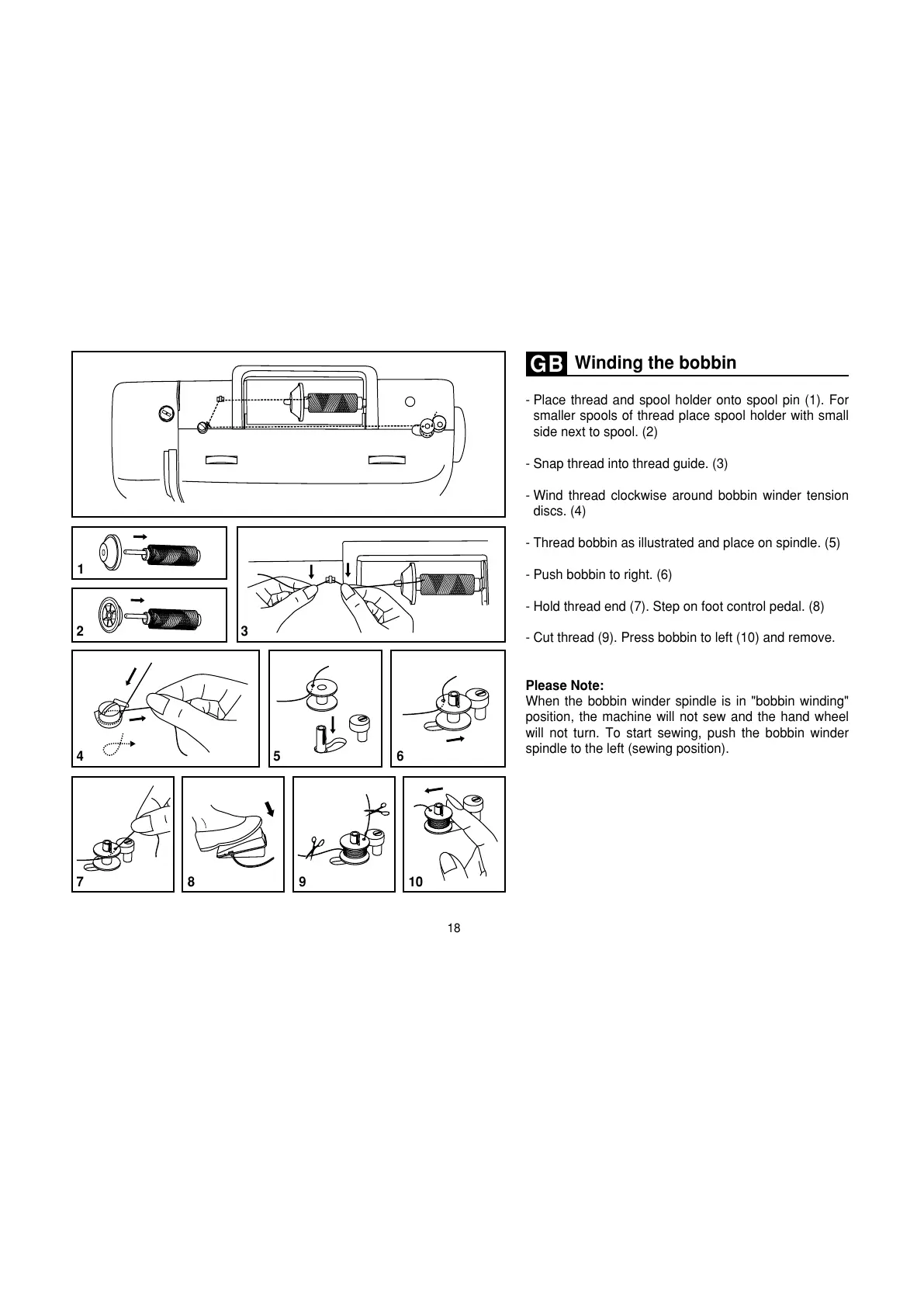 - Cut thread (9). Press bobbin to left (10) and remove.
