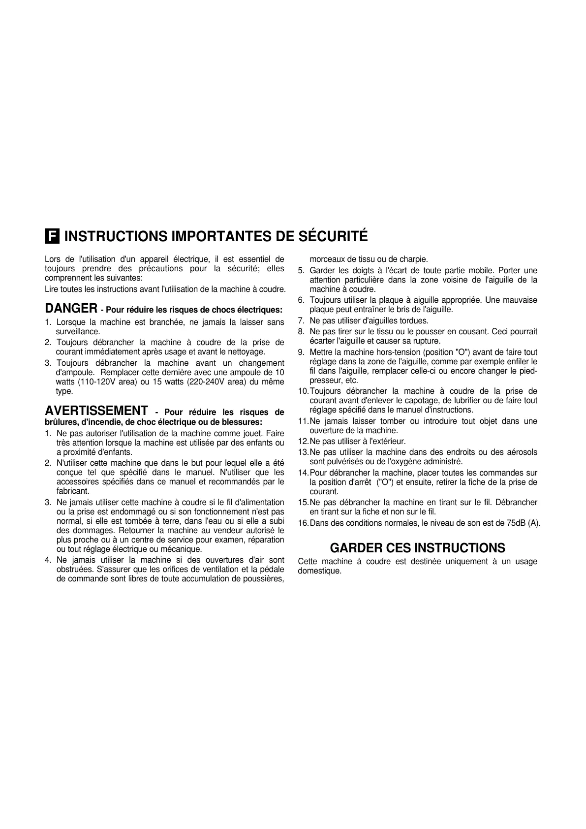 Lire toutes les instructions avant l'utilisation de la machine à coudre.