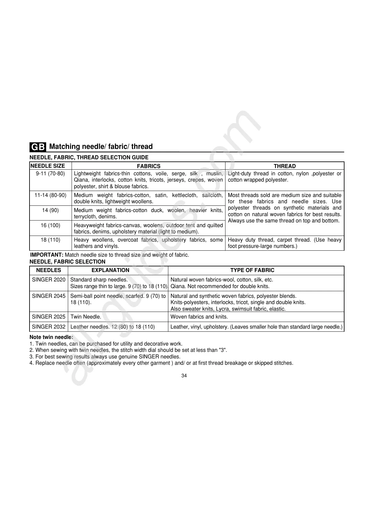 IMPORTANT: Match needle size to thread size and weight of fabric.