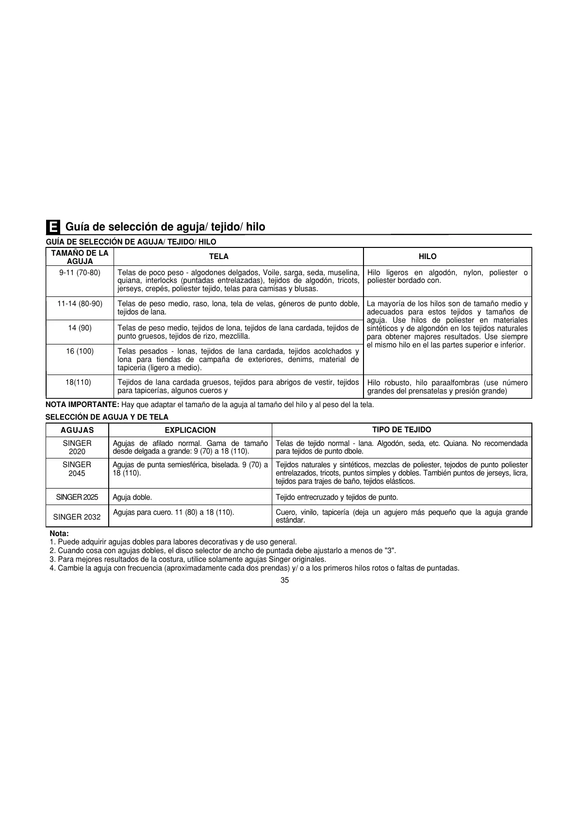 GUÍA DE SELECCIÓN DE AGUJA/ TEJIDO/ HILO