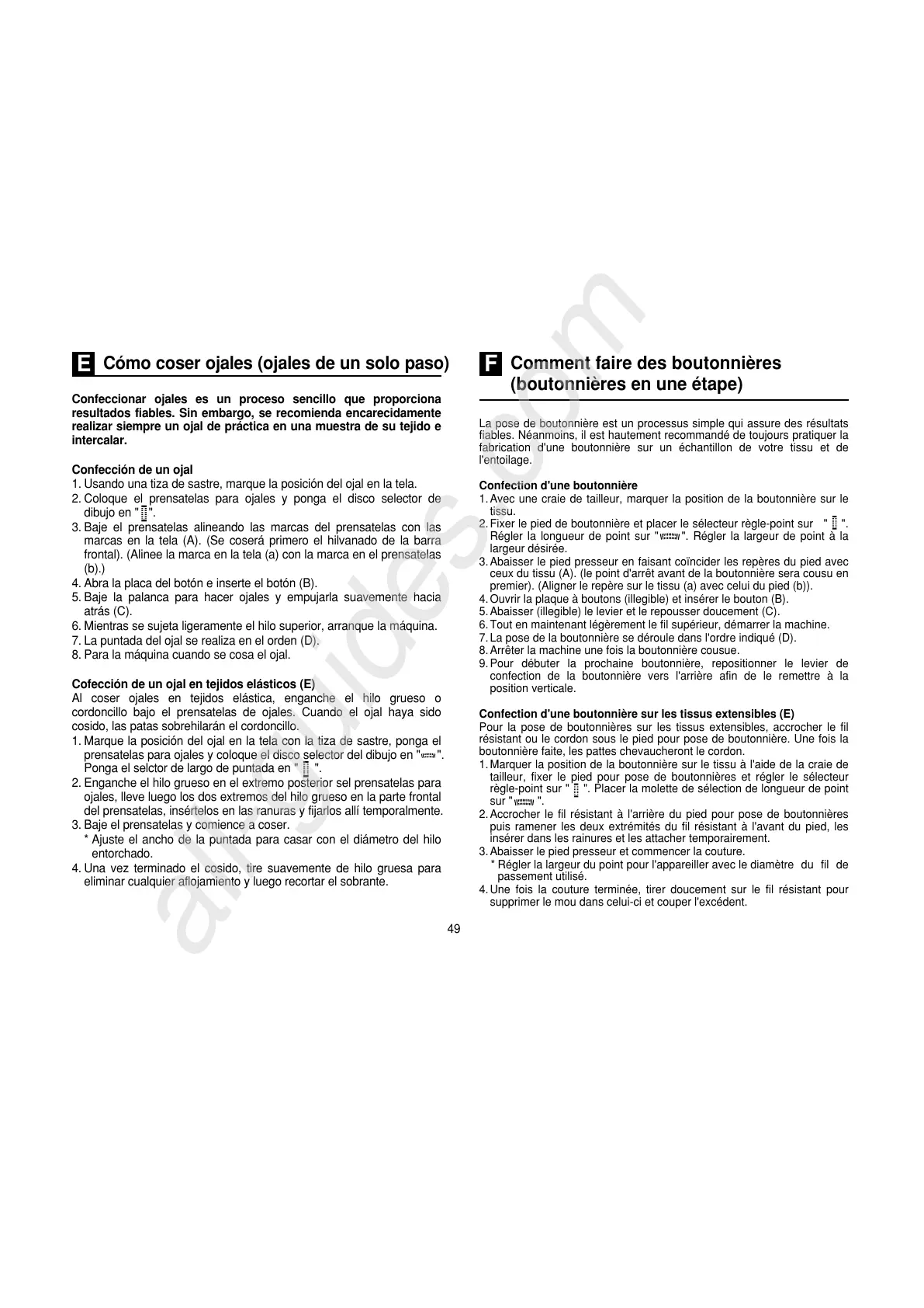 ceux du tissu (A). (le point d'arrêt avant de la boutonnière sera cousu en