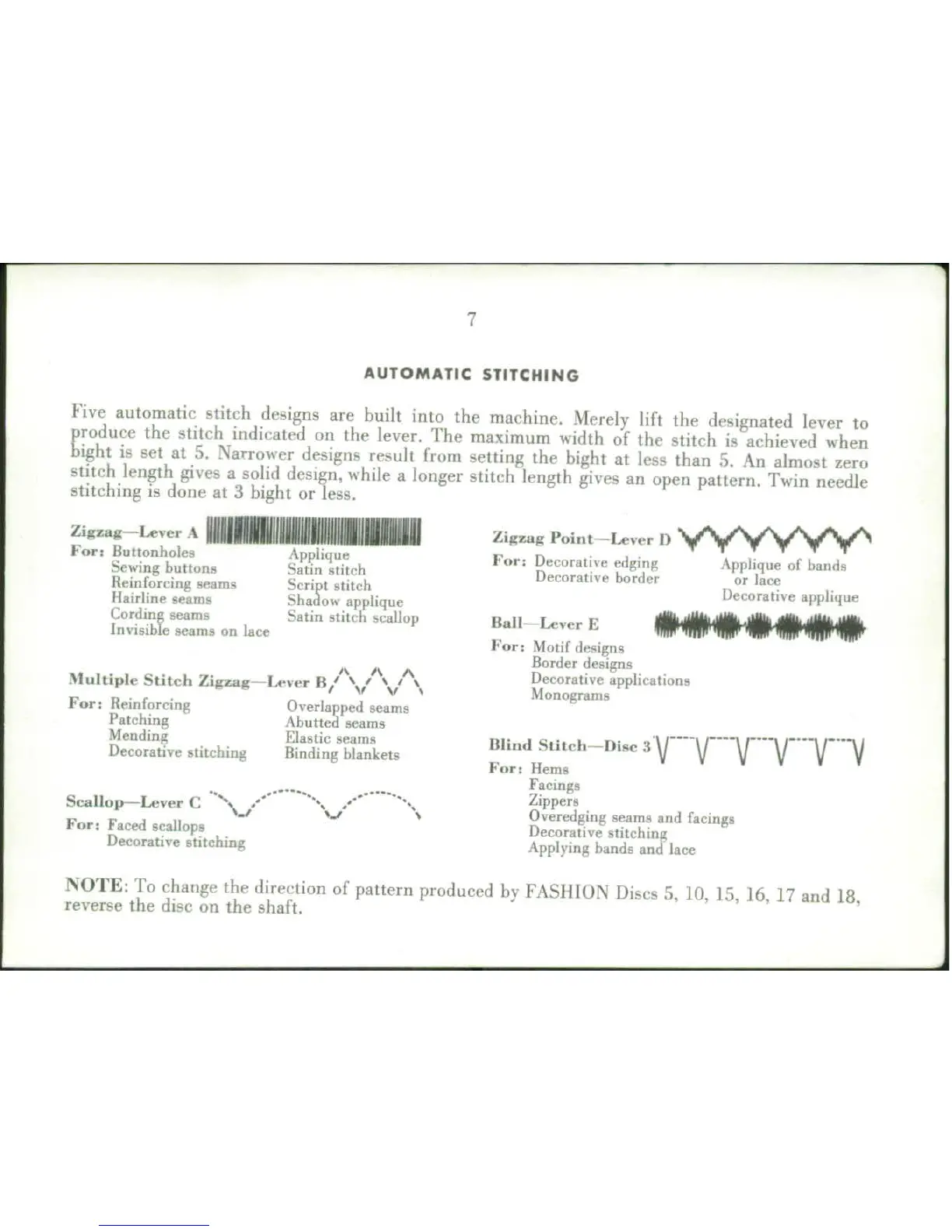 Singer 320K2 - Zigzag Stitching with Lever A; Zigzag Point Stitching with Lever D; Ball Stitching with Lever E; Multiple Stitch Zigzag with Lever B