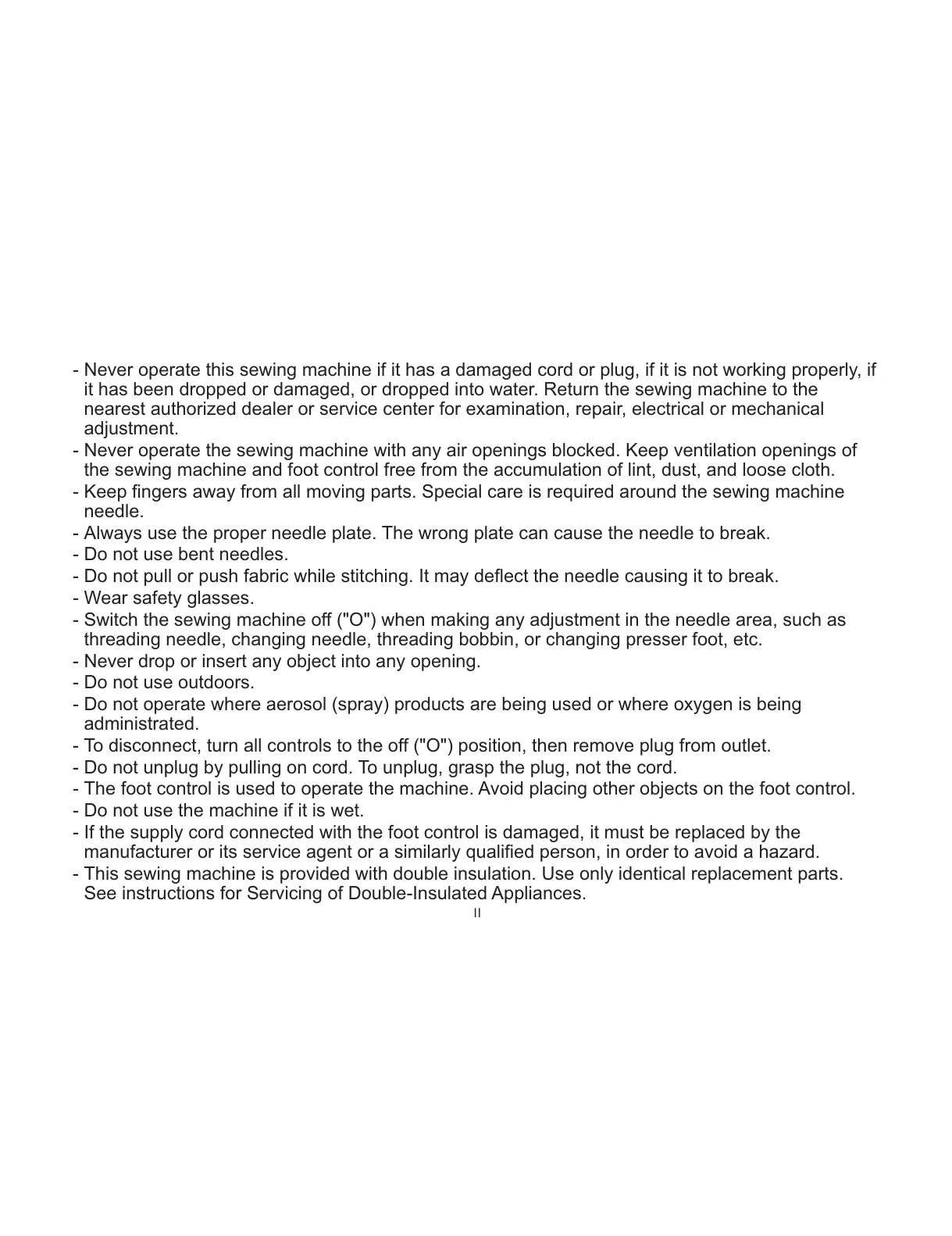 - This sewing machine is provided with double insulation. Use only identical replacement parts.