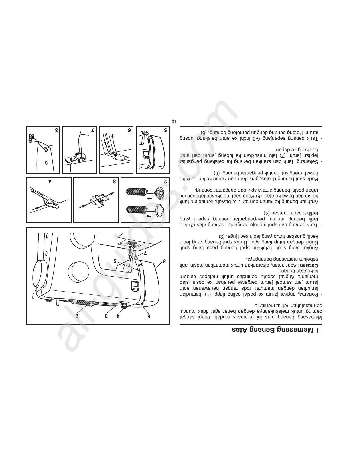 - Tarik benang dari spul menuju pengantar benang atas (3) lalu