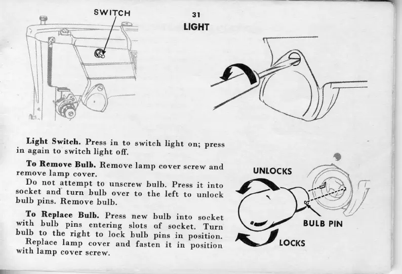 Singer 327 - Light; Light Switch; To Remove Bulb; To Replace Bulb