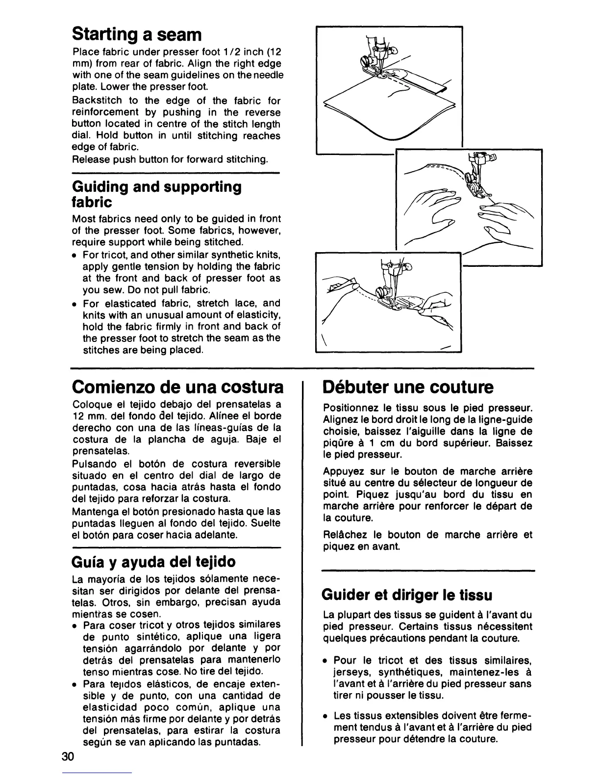 Singer 3270 - Starting a seam; Placing fabric under the presser foot; Guiding and supporting fabric