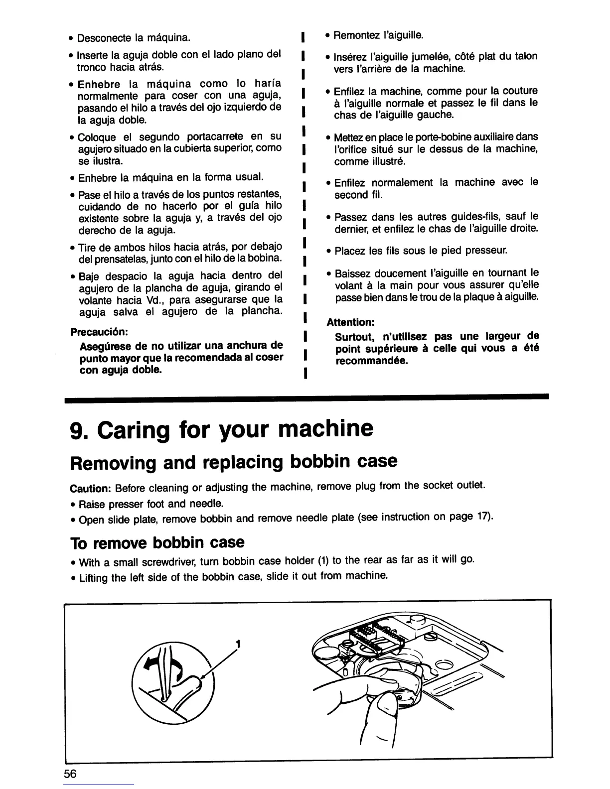 Singer 3270 - 9. Caring for your machine; Removing and replacing bobbin case