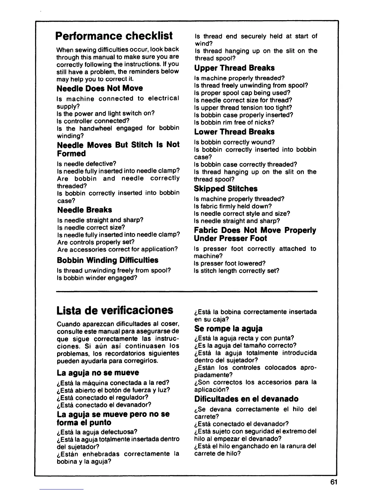 Singer 3270 - Performance checklist; Needle Does Not Move; Needle Moves But Stitch Is Not Formed; Needle Breaks