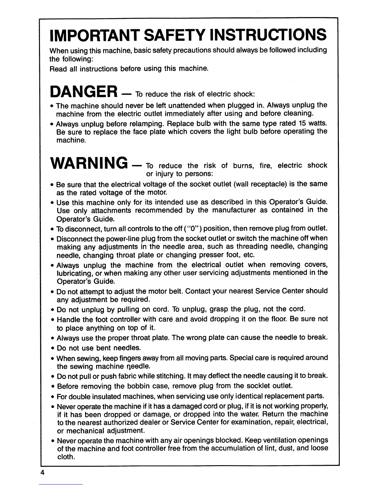 Singer 3314 - IMPORTANT SAFETY INSTRUCTIONS; DANGER and WARNING Precautions
