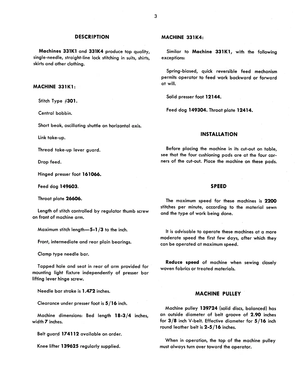 Singer 331K4 - Machine Description; Machine Installation; Machine Speed Specifications; Machine Pulley Details