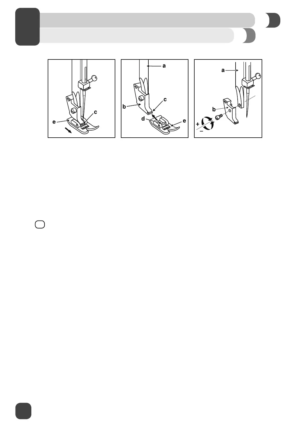 a la barra presionadora (a). El prensatelas (e) tiene un perno (d) que une con el sujeta prensatelas,